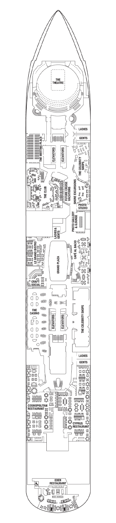 A transformative space to gather. Experience a majestic, open, three-story venue inspired by the piazzas of Italy and the invigorating energy of everyone coming together to savor a taste of the good life. Home to our incredible specialty restaurants, along with our popular Martini Bar, Café al Bacio, and Craft Social Bar. The Grand Plaza is the ultimate gathering place on Celebrity Apex.