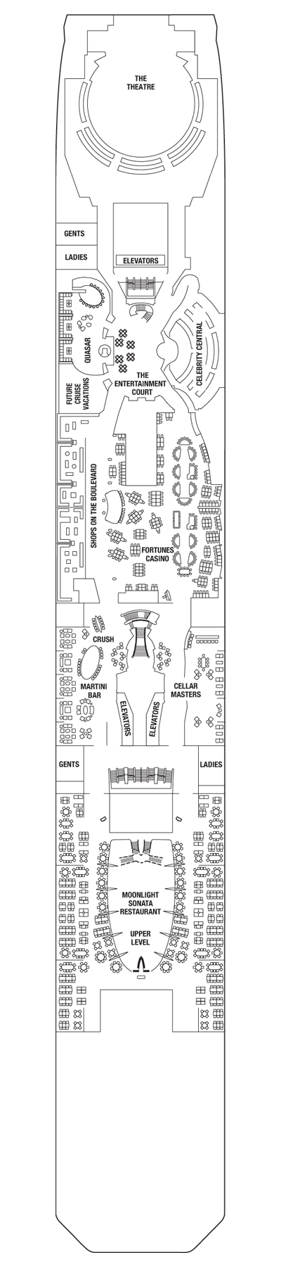 The Theatre is the premier live performance venue aboard Celebrity Eclipse®. While accommodating a generous audience, it retains a comfortable, intimate atmosphere, bringing you production shows, beautiful musical arrangements, and sidesplitting comedy.