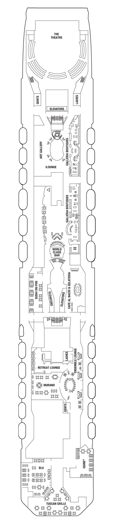 Our stunning foyer greets you with a spectacular onyx staircase, marble floors and the first panoramic ocean-view glass elevators at sea.